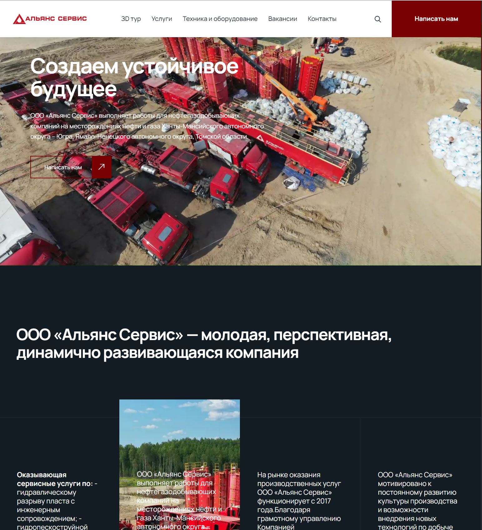 IT-студия «Идеаль» разработала корпоративный сайт для компании «Альянс Сервис» — одного из ключевых игроков в области добычи полезных ископаемых, специализирующегося на технологии гидравлического разрыва пласта.